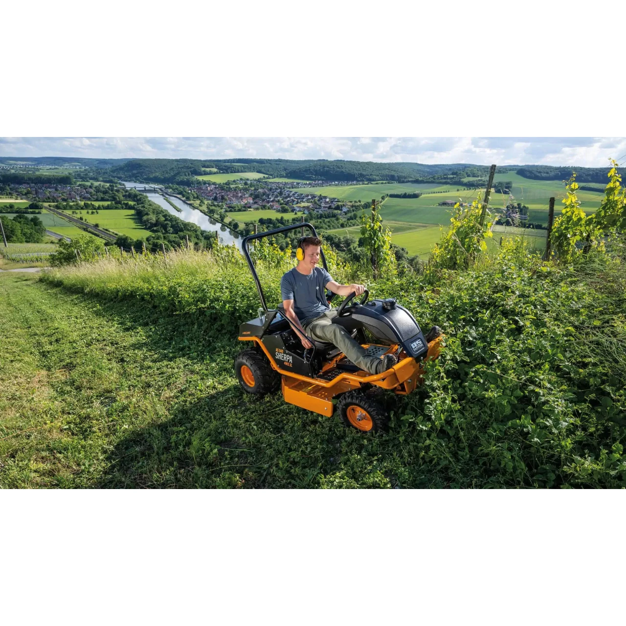 Komfortables und sicheres Mähen am Hang mit dem AS 940 Sherpa 4WD XL. Eine Maximalleistung von 27 PS bei 724 ccm leistet der 2-Zylinder Professional Series 8 Motor von Briggs & Stratton. Der Motor ist voll hangtauglich durch Benzin-, Ölpumpe und Öldrucksensor. Am Hang besticht der Aufsitzmäher mit seinem permanenten Allradantrieb, seiner großen XL-Ackerstollenbereifung, einem sehr niedrigen Schwerpunkt und einem geringen Gesamtgewicht von nur 298 kg. Angetrieben wird der Aufsitzmäher über einen stufenlosen Hydrostat. Dieser ermöglicht eine stufenlose Geschwindigkeitseinstellung von 0 – 6,7 km/h vorwärts und 0 – 6,5 km/h rückwärts. Gesteuert wird der Hydrostat ausschließlich über den Fahrhebel, der vier Funktionen beinhaltet: die Vor- und Rückwärtsbewegung, die Bremse und die Parkbremse. Auf der rechten Seite befindet sich zusätzlich ein Notbremspedal wie beim PKW. Bei Schlupf auf der Hinterachse oder durchdrehenden Rädern kann jederzeit die Differenzialsperre der Hinterachse per Fußpedal zugeschaltet werden.