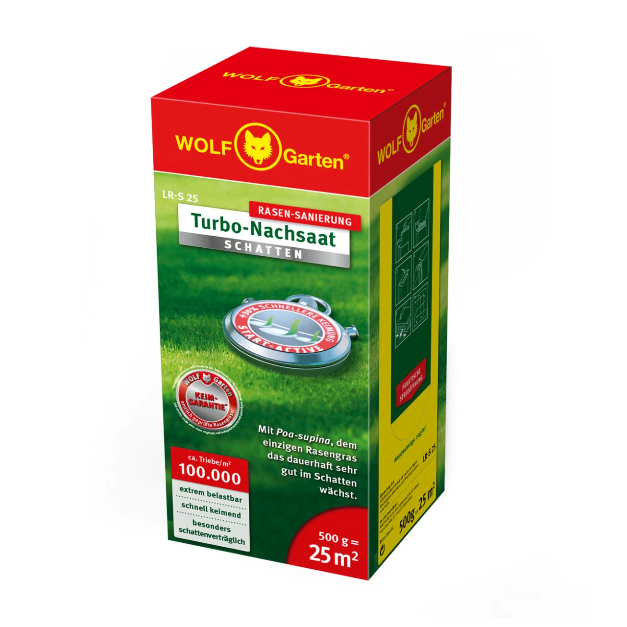 Bewährte „TURBO-NACHSAAT« Rasenmischung für schnelles Schließen von Rasenlücken.